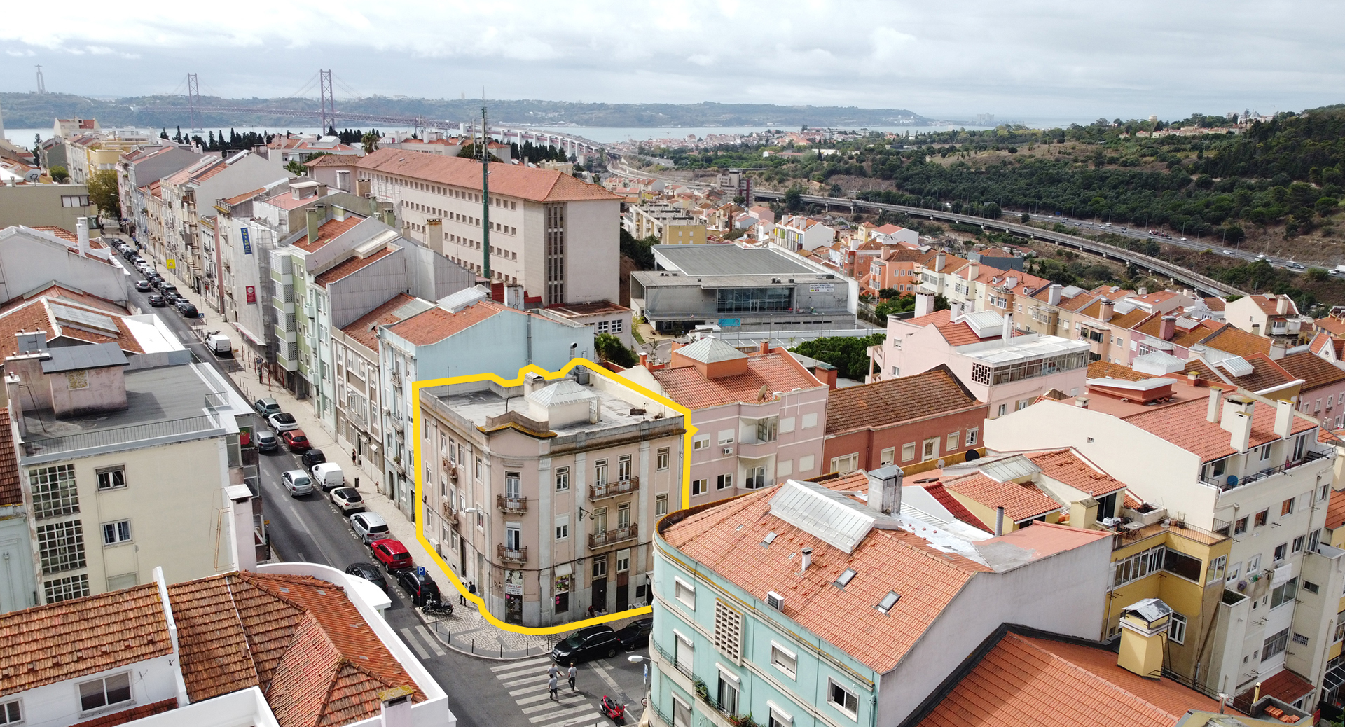 Prédio Devoluto (excepto Restaurante - Loja A) datado de 1934, localizado em Campo de Ourique na Rua Correia Teles tornejando para a Rua Sampaio Bruno.