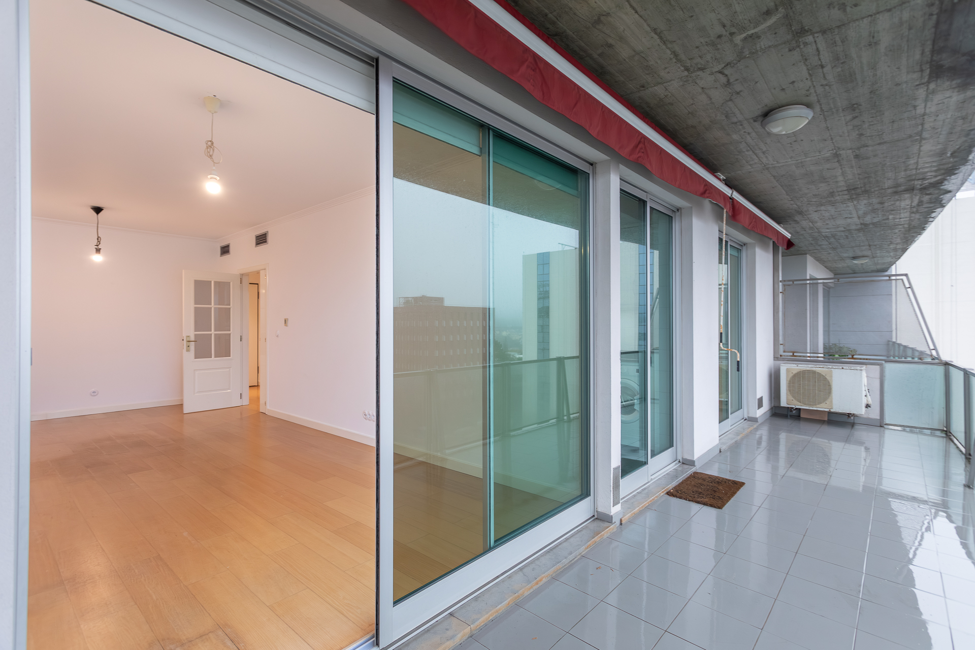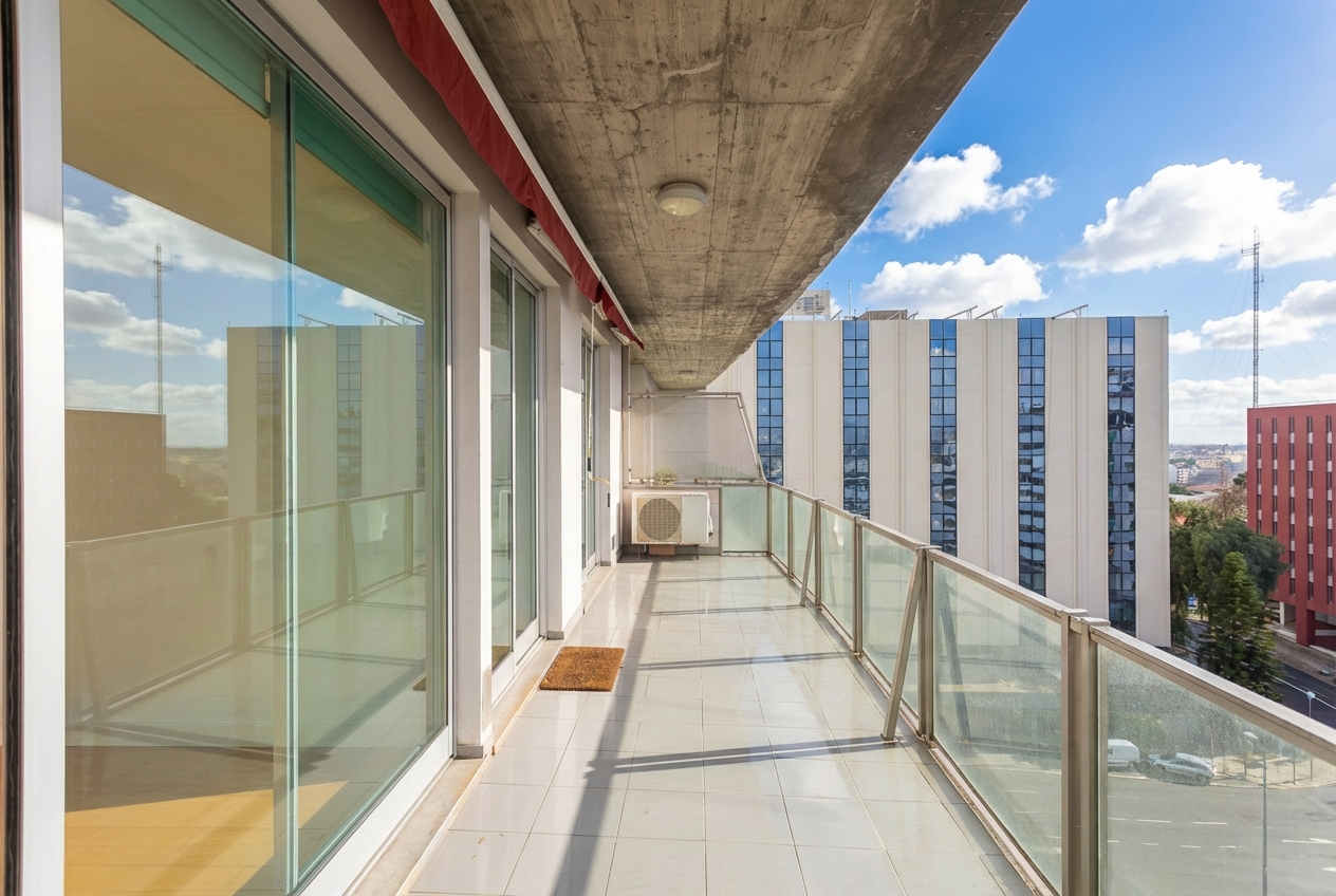 Este T1, situado num andar alto e orientado a poente, beneficia de luminosidade constante ao longo da tarde e vista desafogada sobre a cidade. A varanda generosa acompanha todo o apartamento — da sala ao quarto e à cozinha —, criando uma ligação fluida entre interior e exterior e ampliando naturalmente a sensação de espaço.
