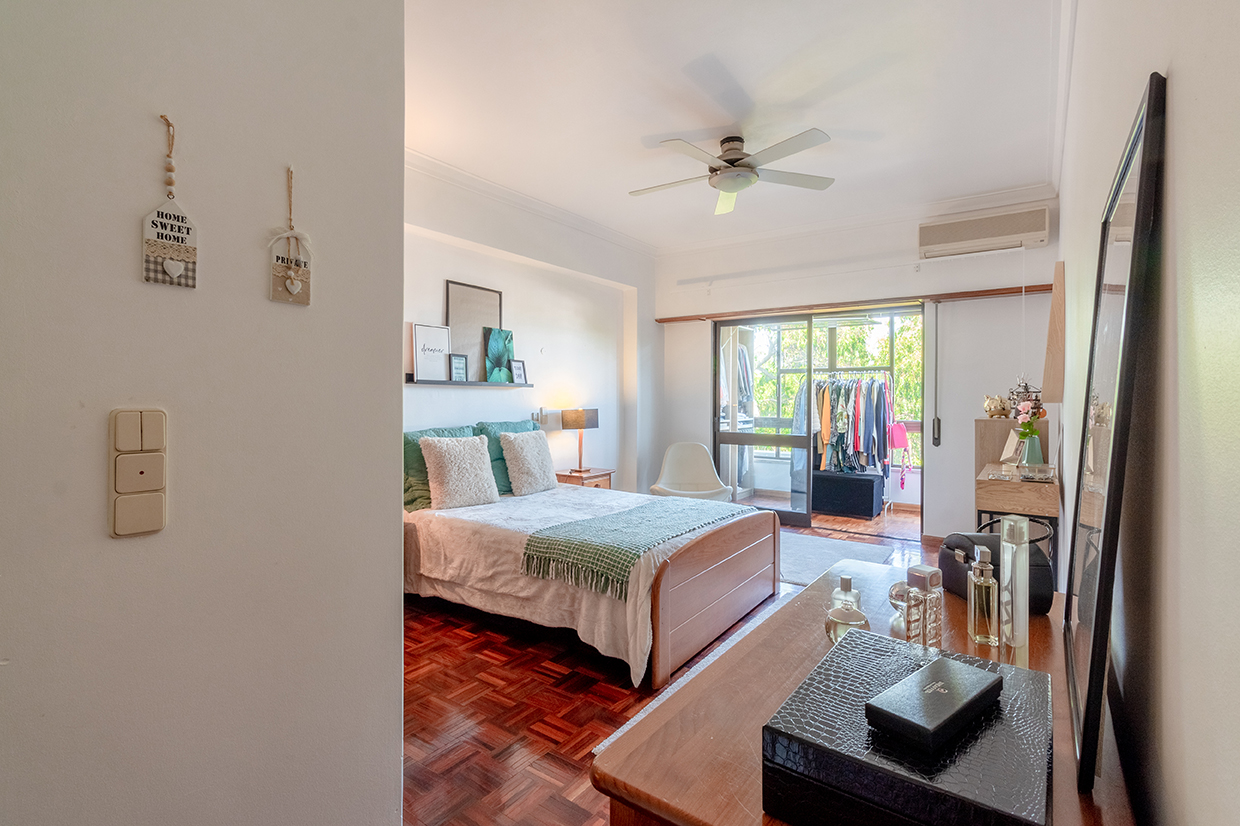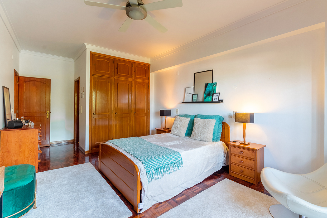 Apartamento com 3 quartos todos com roupeiro, um deles em suite, que usufruem de uma varada fechada em todo o comprimento.