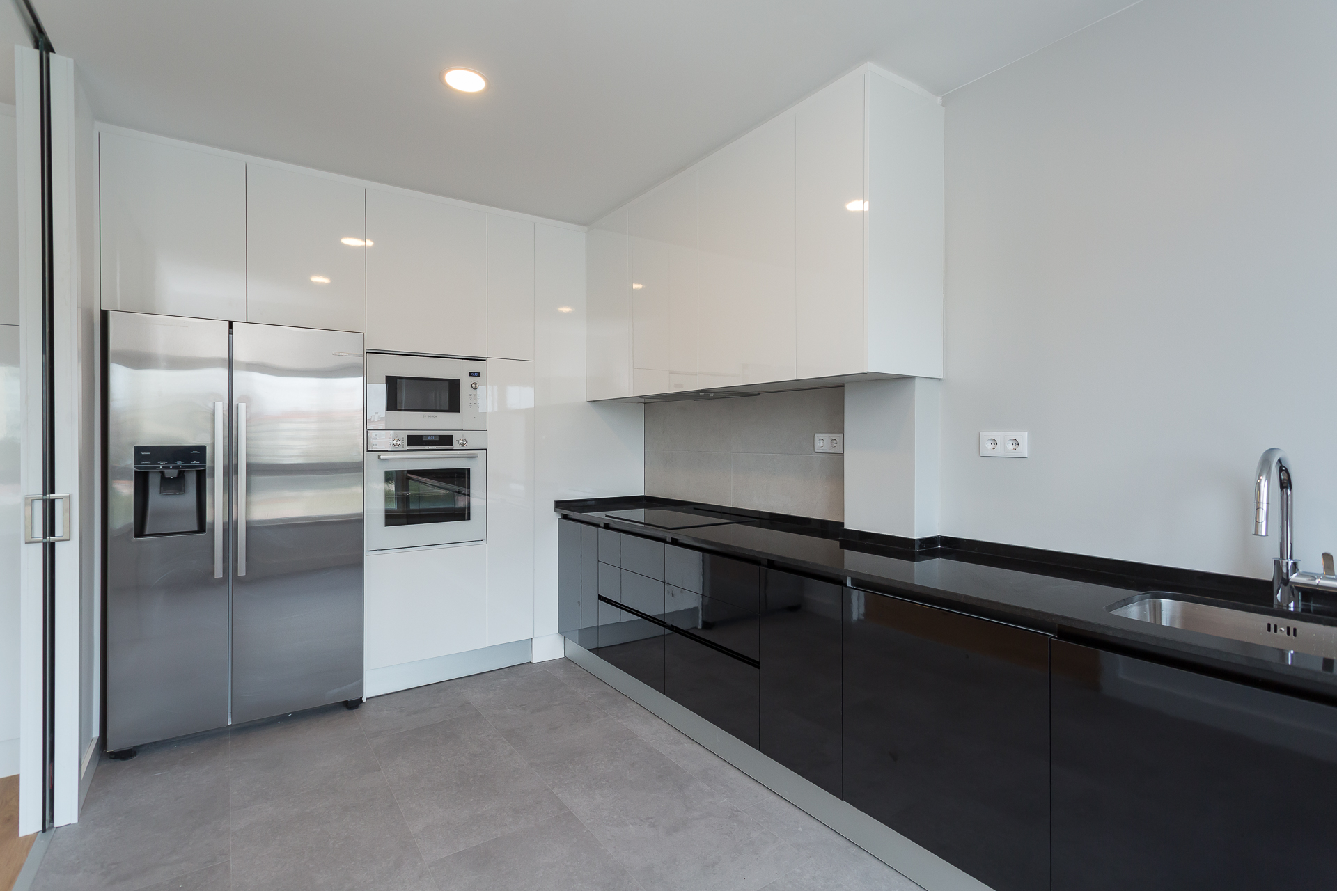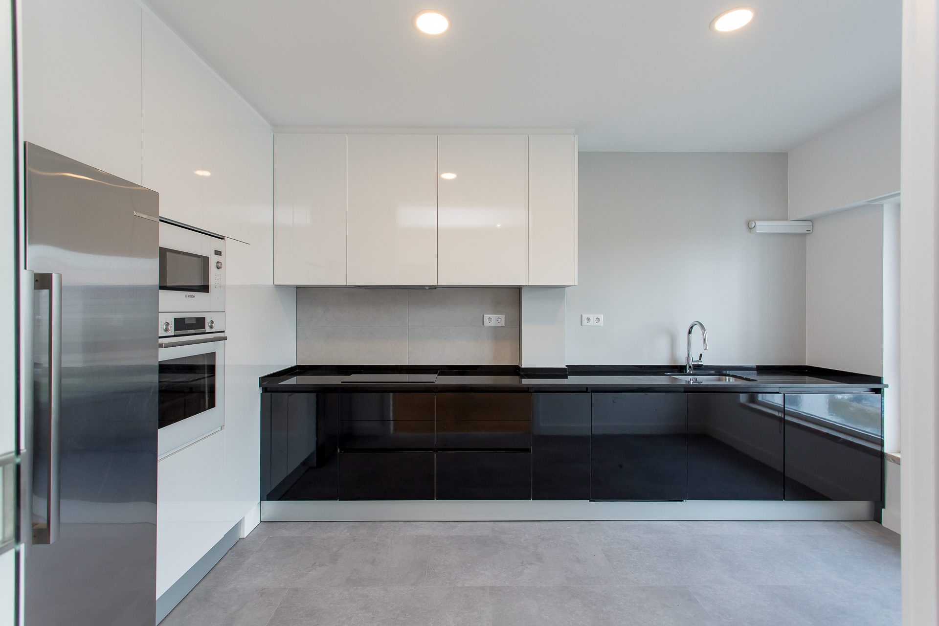 A cozinha equipada com frigorífico, placa, forno, exaustor, micro-ondas e máquina de lavar loiça.