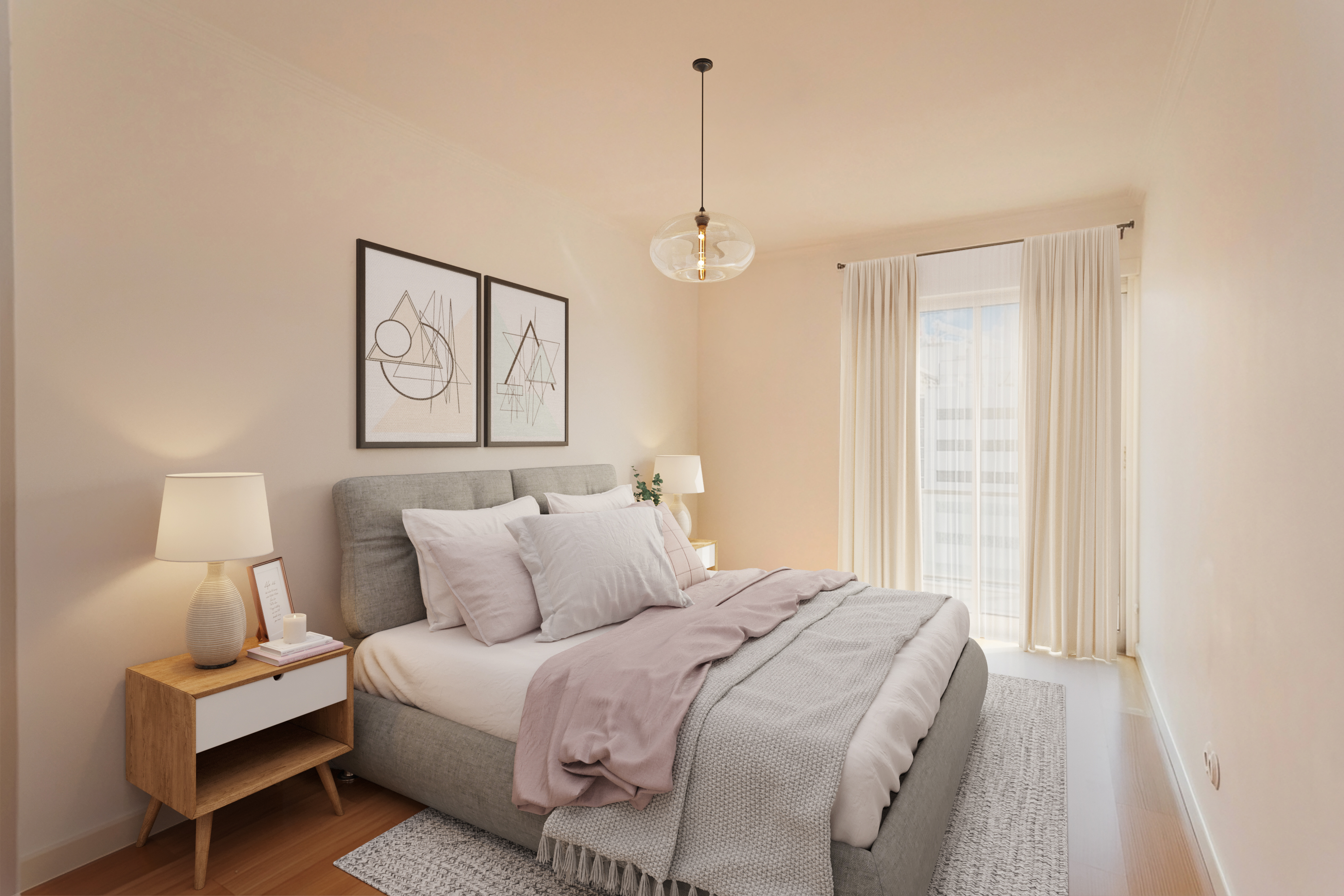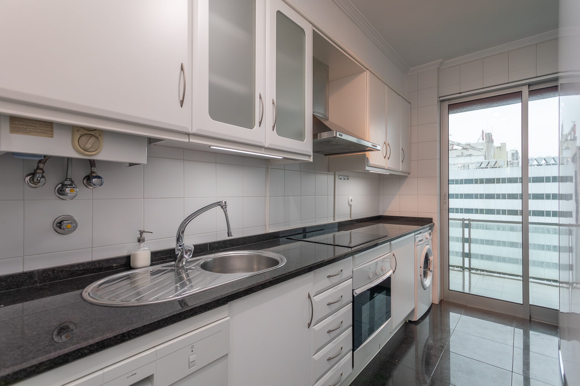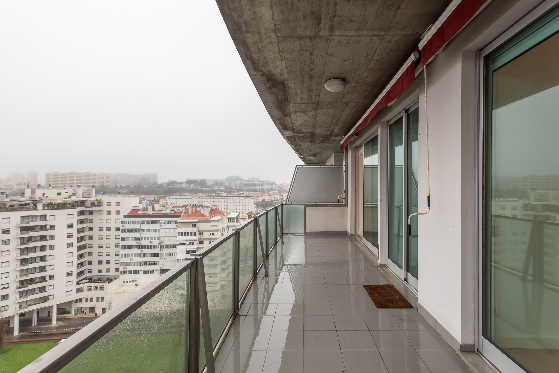 Este T1, situado num andar alto e orientado a poente, beneficia de luminosidade constante ao longo da tarde e vista desafogada sobre a cidade. A varanda generosa acompanha todo o apartamento — da sala ao quarto e à cozinha —, criando uma ligação fluida entre interior e exterior e ampliando naturalmente a sensação de espaço.
