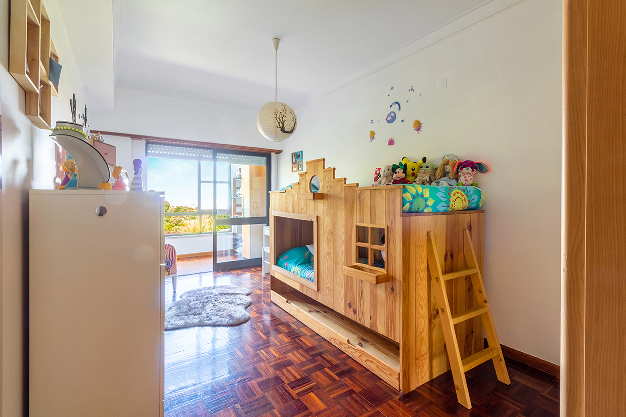 Apartamento com 3 quartos todos com roupeiro, um deles em suite, que usufruem de uma varada fechada em todo o comprimento.